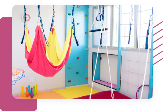 A nossa sala de integração sensorial é um ambiente com objetos e equipamentos especialmente projetados para fornecer estímulos sensoriais variados e organizados. Seu propósito na terapia ocupacional é promover a regulação sensorial, trabalhando a maneira como as sensações são processadas pelo cérebro do indivíduo, o que contribui para o desenvolvimento da criança.